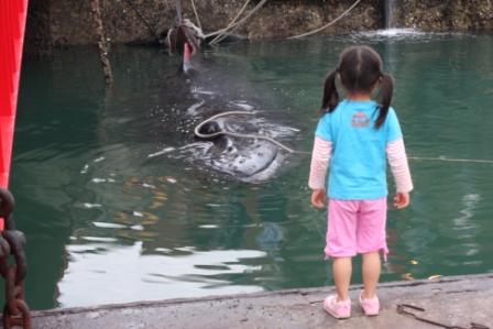 今日の早朝、元気なのを確認し沖合いまで船で曳航?し、無事海に帰したと言う情報である。(よかった、よかった)