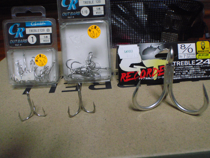 トレブルフックのサイズ 左#1 中1/0 右8/0