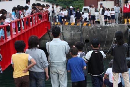 のぞきこむと、大きなくじらの姿が見えた。はじめは、怖がっていた娘も大はしゃぎしだした。