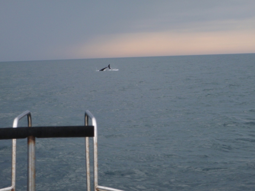 ふと、沖を眺めていると何かがはねた。やっぱりマンビキ釣りにチェ~ンジとボートを走らせた。が、イルカの群れだった。