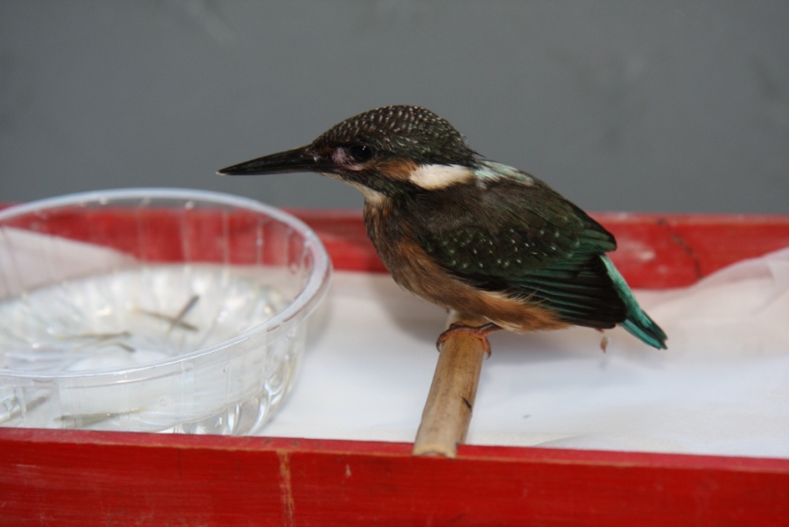 早く自力で魚を捕れるようになってもらおうと、小魚(カワムツの幼魚)を活かした容器を鳥かごの中に置いて様子を見ようと思う。