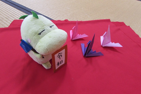 令和の時代が平和でありますように、願いをこめて!御所浦のゆるキャラ、てらのくんと令和カラーで、祝い鶴を折ってみました~(*^_^*)