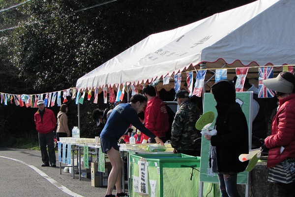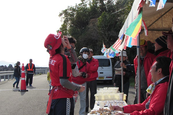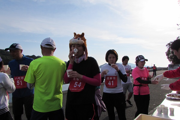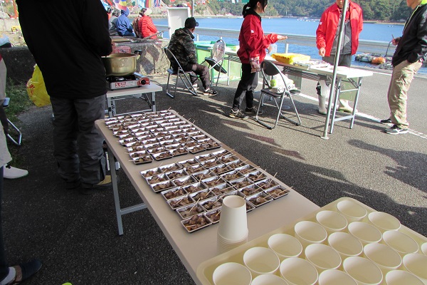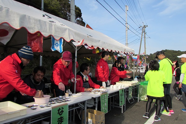 ランナーのみなさんが楽しみにしてくださっている、牧島地区・給水所のおもてなし料理は、だご・鯛の吸物・なまこ・太刀魚のみりん干しでした。大変、喜ばれました!