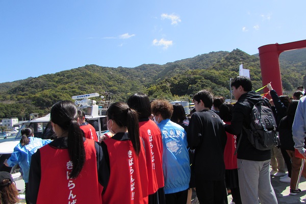 ▼先生方を乗せた船を生徒たちは感謝の気持ちで見送ります
