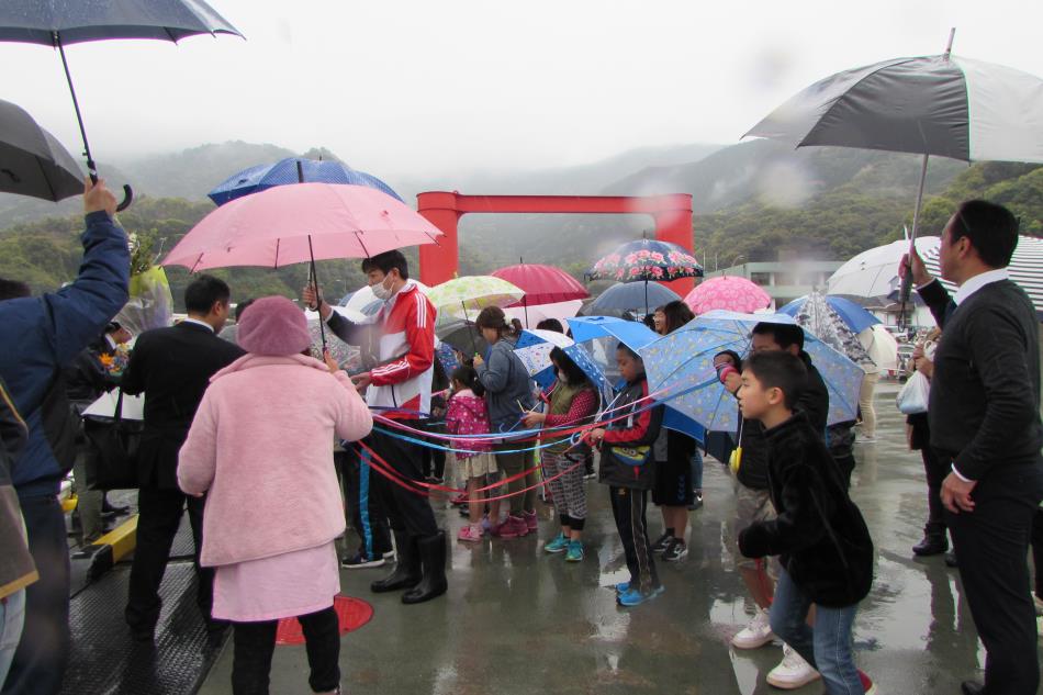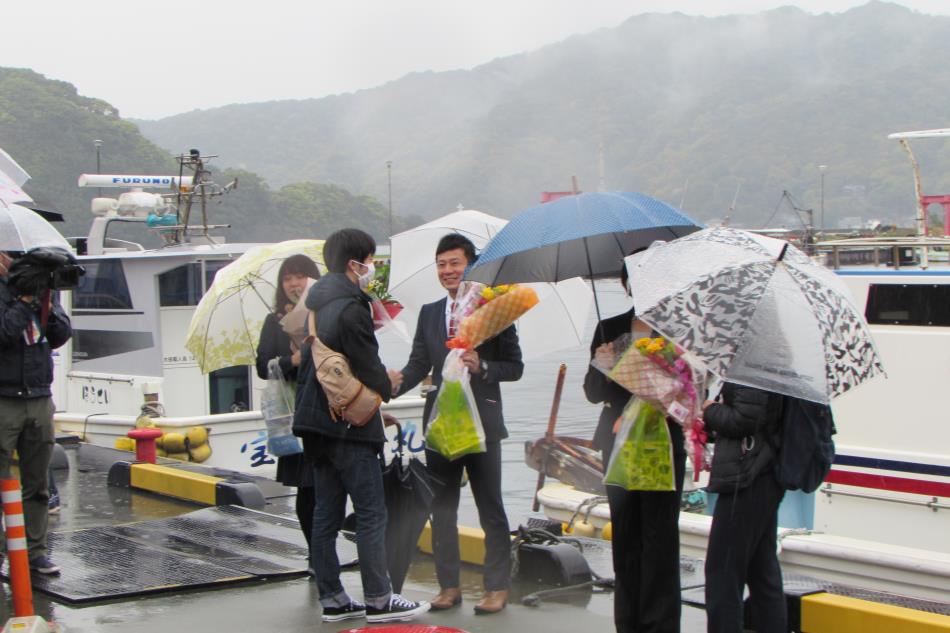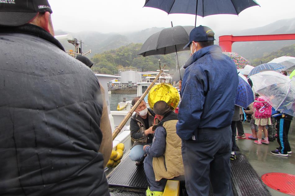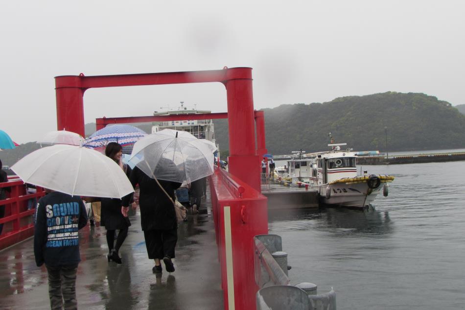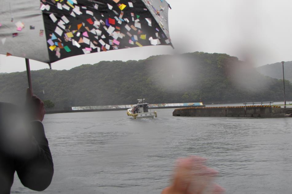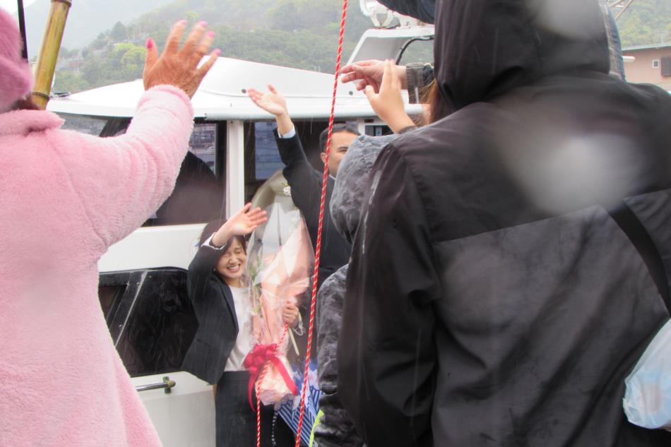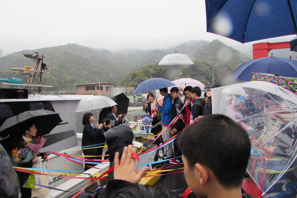 すこし冷たい雨の中ではありましたが、大勢の見送りの人が港に集まり先生との最後の楽しい時間をすごしました。