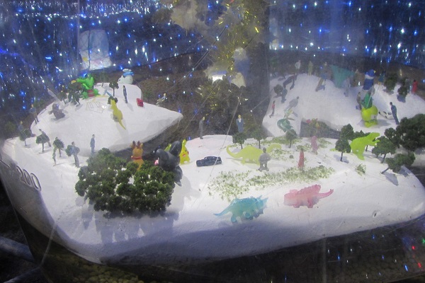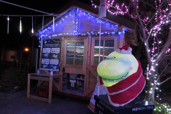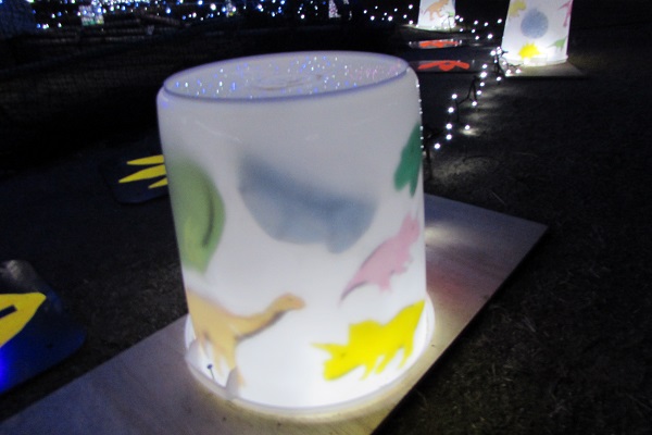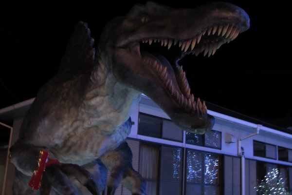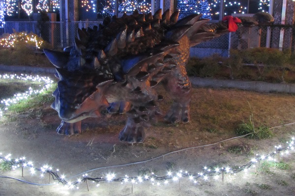 ▼イルミネーションと恐竜‼しっぽの赤いリボンがなんとも・・・